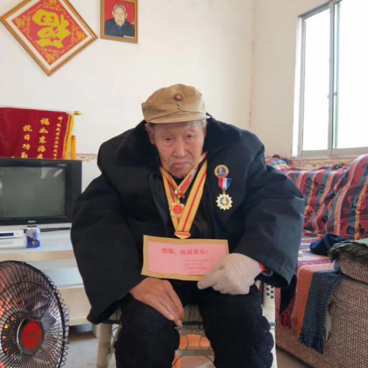 于老已年满100,照顾他的阿姨向我们介绍,他的听力不大好,但是视力还很不错,平时最喜欢看抗日剧。我们围着坐在烤火器旁的于老,佩戴在于老胸前的徽章熠熠生辉,我们从他的眼中看到了军人的坚定。